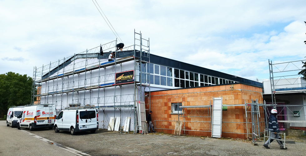 En effet le nouveau toit est en place, les finitions avec les habillages latéraux se terminent. Au courant du mois d'octobre, le toit de la petite salle sera également refait à neuf par la société MTE avec la mise en place d'un toit végétalisé à l'instar de ce qui est fait pour les vestiaires.