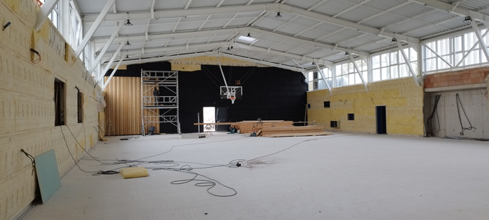 Pour les vestiaires les travaux continuent avec la finition du faux plafond et l'intégration des lampes. Il restera la pose finale des sanitaires.
